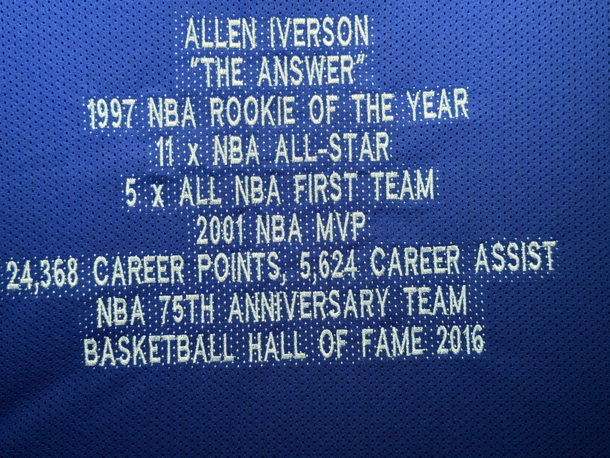 This format transforms the jersey into a complete tribute to Iverson's revolutionary impact, showcasing every major milestone from his Rookie of the Year campaign through his final season. The signature combined with his documented achievements captures the essence of Iverson's fearless scoring prowess and cultural influence that changed basketball forever.