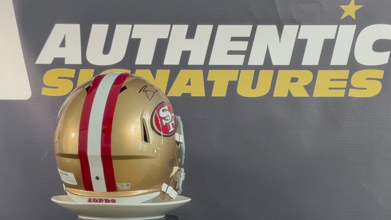 This authentic 49ers helmet features Brock Purdy's signature, representing his continued development as one of the NFL's most promising young quarterbacks following his remarkable rookie season. Purdy's exceptional accuracy, decision-making, and leadership qualities have quickly established him as a cornerstone of San Francisco's championship aspirations and offensive future. The signature captures the ongoing success of a player who transformed from "Mr. Irrelevant" into a franchise quarterback through preparation and performance. This helmet celebrates Purdy's role as the face of the 49ers' next generation while honoring his rapid ascension in Kyle Shanahan's offensive system. The scarlet and gold represent Purdy's connection to one of the NFL's most successful quarterback traditions.