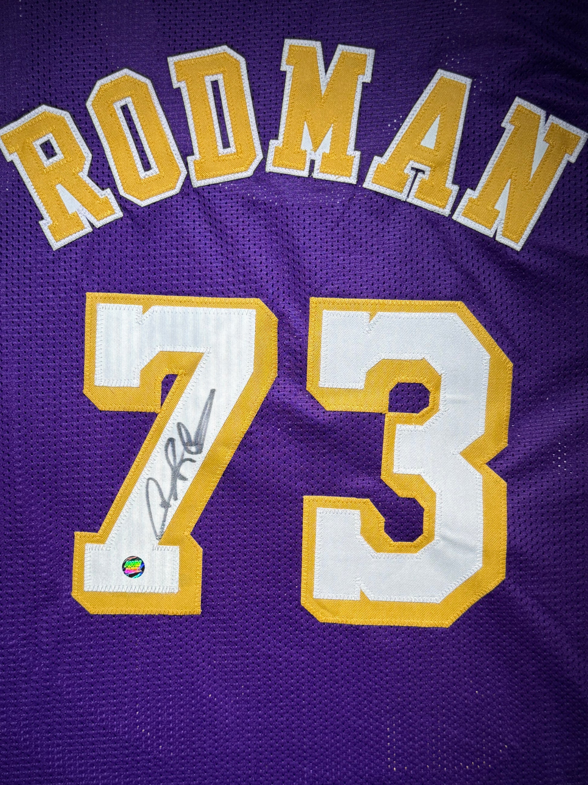 This authentic Los Angeles Lakers jersey features Dennis Rodman's signature in the distinctive purple colorway, representing his brief but memorable West Coast chapter after his legendary Bulls dynasty years. The jersey captures Rodman's 1999 Lakers tenure, where "The Worm" brought his fierce rebounding intensity and championship experience to the storied franchise alongside Shaquille O'Neal and Kobe Bryant.
