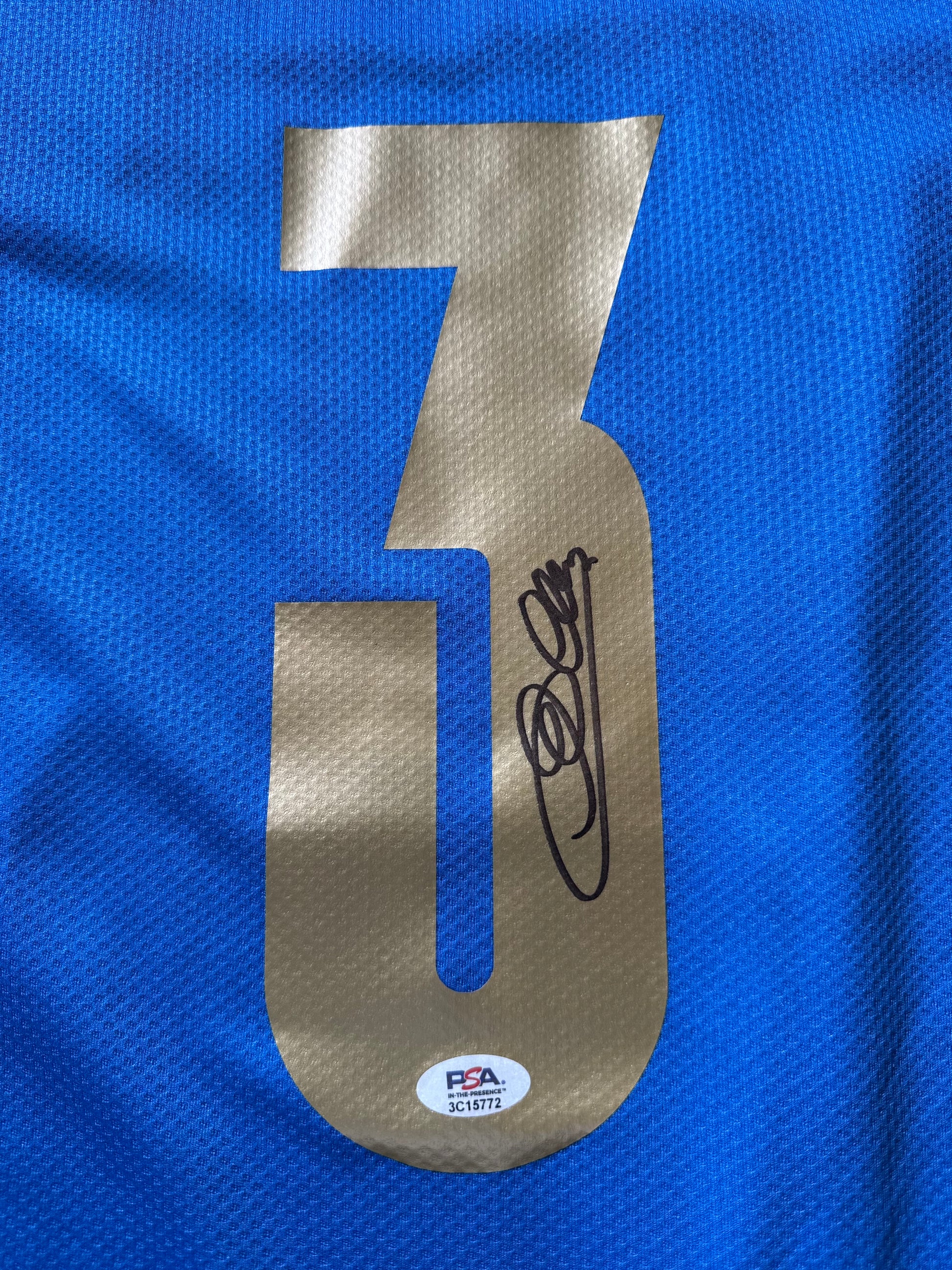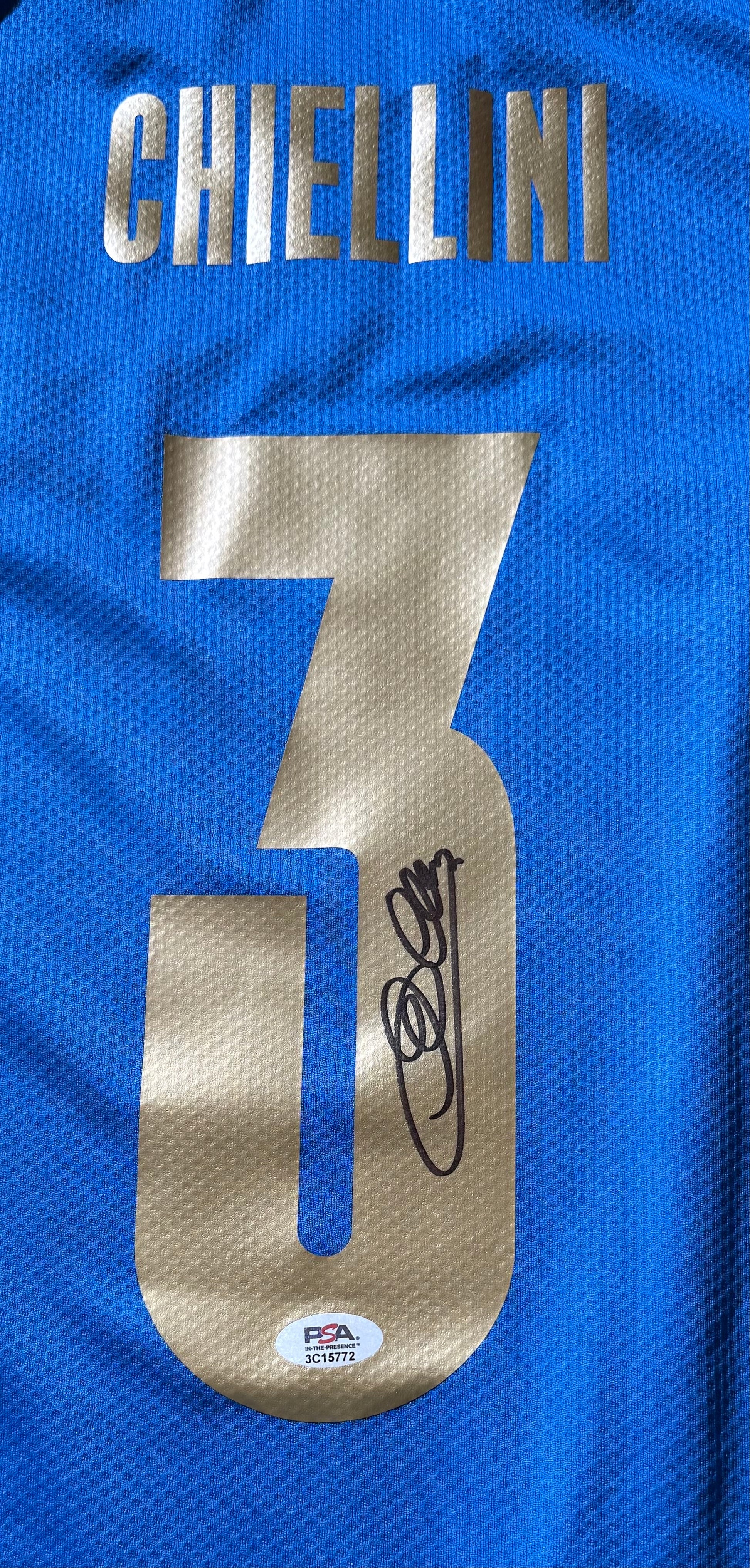 This authentic Italy Puma jersey bears the signature of Giorgio Chiellini, the warrior defender who captained Italy to European Championship glory in 2021. Known for his fierce determination, tactical intelligence, and unwavering commitment to the Azzurri, Chiellini embodied the fighting spirit of Italian football throughout his international career.