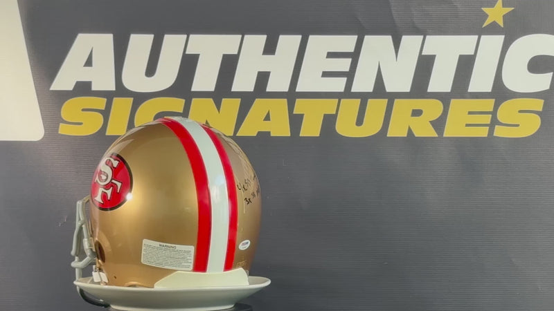 This San Francisco 49ers full-size authentic on-field VSR4 helmet features Joe Montana's signature alongside multiple statistical inscriptions celebrating his legendary career achievements and championship excellence. The premium piece showcases Montana's incredible statistical accomplishments combined with his unparalleled championship success, representing the complete legacy of the quarterback who defined clutch performance and Super Bowl greatness. The detailed inscriptions provide a comprehensive view of Montana's dominance during the golden era of 49ers football and his record-setting postseason performances. This helmet serves as a permanent record of Montana's statistical excellence and championship achievements that established the modern standard for quarterback greatness. The multiple inscriptions transform this authentic helmet into a museum-quality celebration of the most successful quarterback in NFL history.