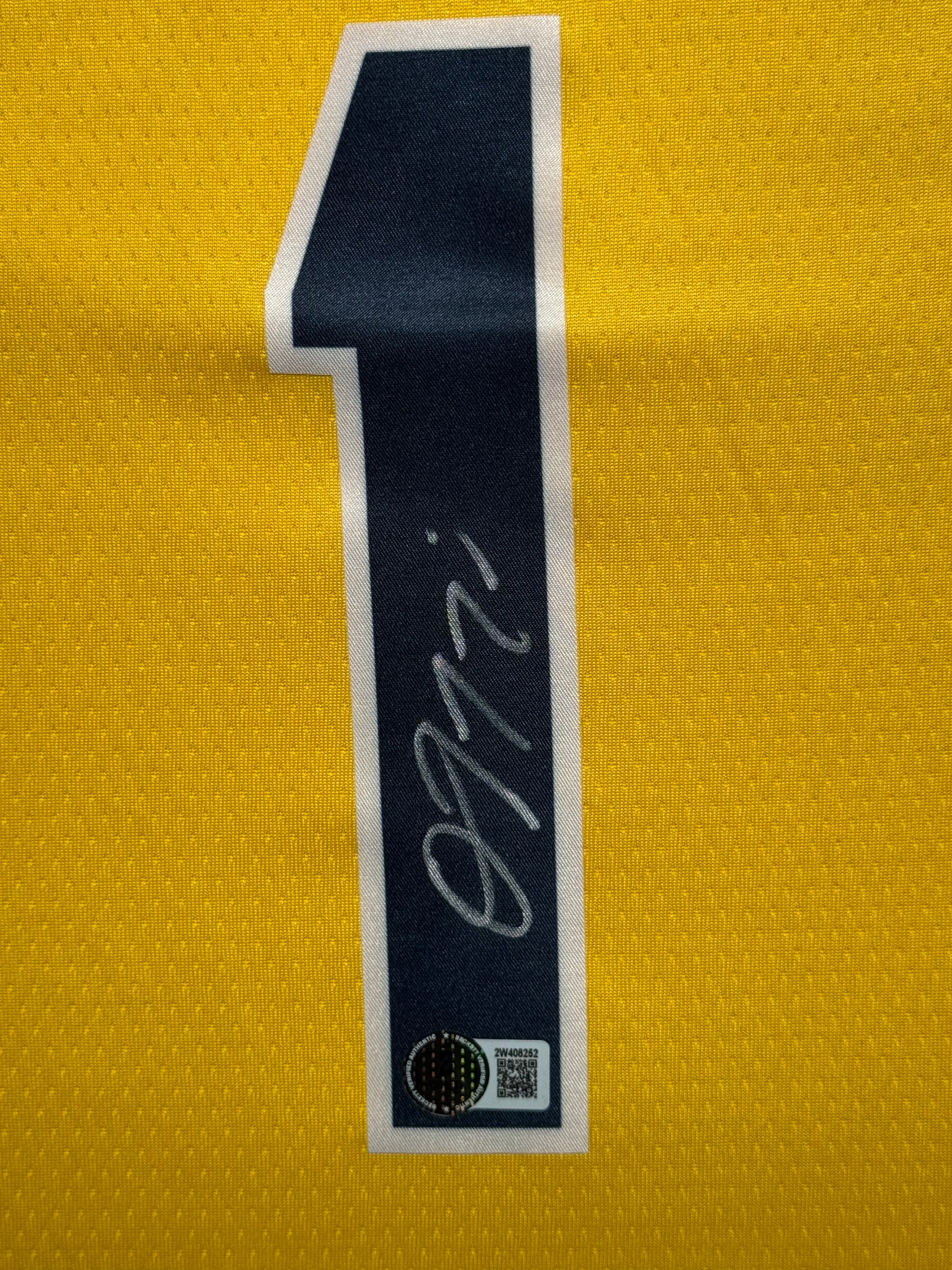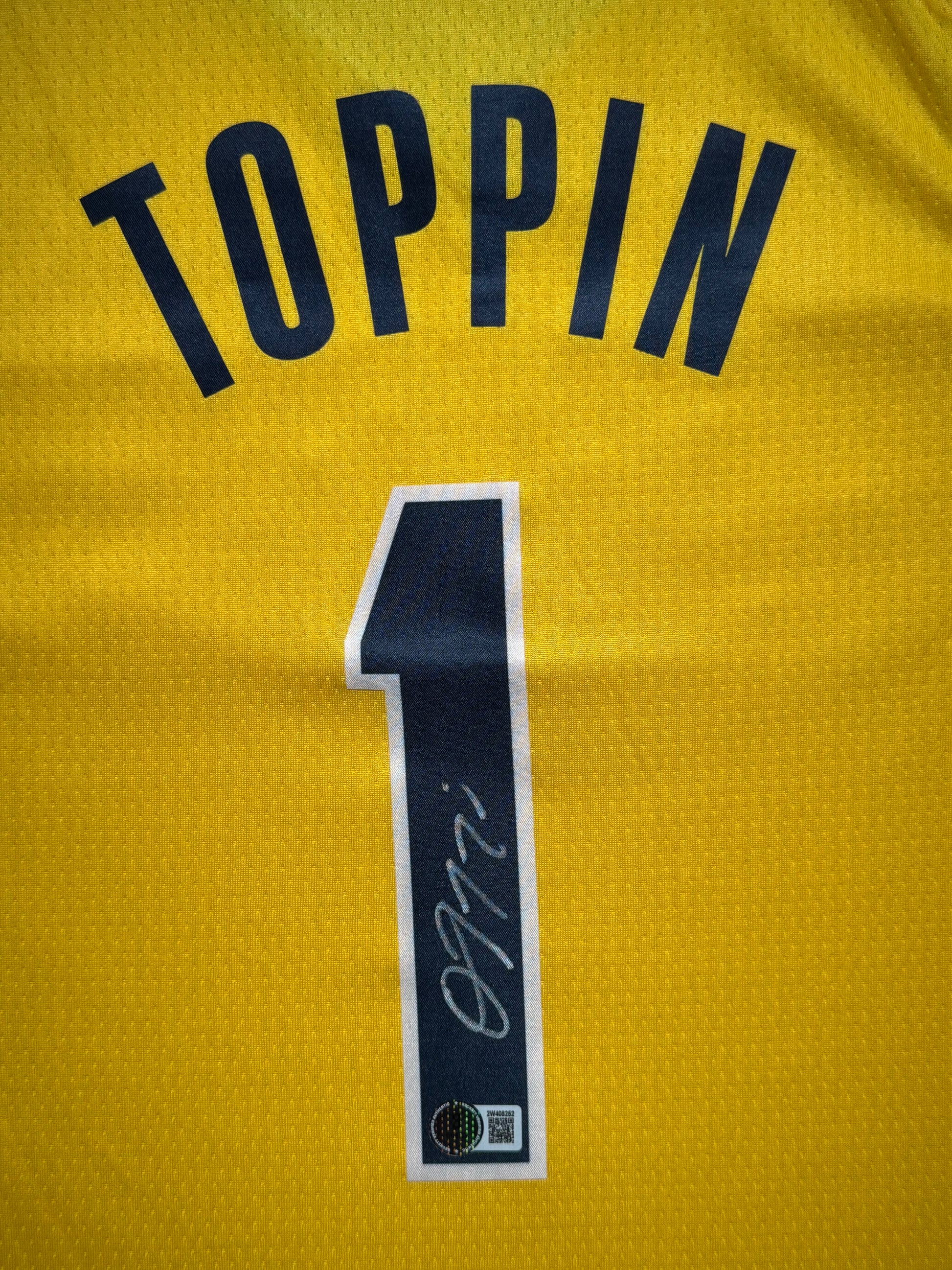 This gold home piece captures Toppin's development as a versatile scorer, showcasing the thunderous dunks and positive energy that made him an exciting contributor to the Pacers' up-tempo style. The signature commemorates the athletic forward whose work ethic and high-flying performances established him as an important piece of Indiana's competitive Eastern Conference roster.