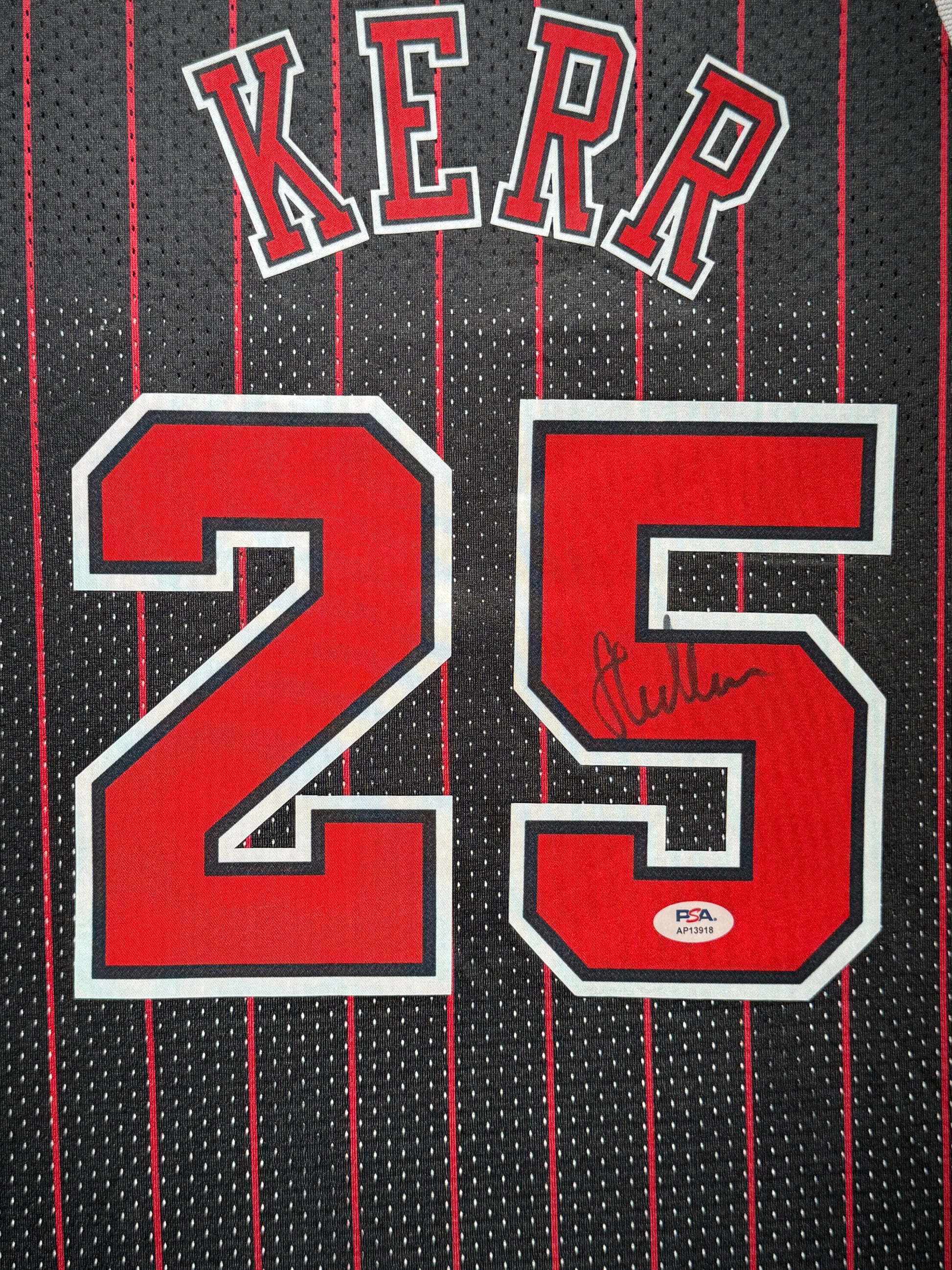 This authentic Chicago Bulls jersey features Steve Kerr's signature with the official Finals patch, commemorating the sharpshooter during Chicago's championship dynasty years from 1993 to 1998, when his clutch three-point shooting helped deliver three NBA titles alongside Michael Jordan and Scottie Pippen. The jersey celebrates Kerr's exceptional shooting accuracy and basketball intelligence at the United Center, where his reliable perimeter scoring and championship experience provided crucial spacing for Phil Jackson's triangle offense during the Bulls' second three-peat.