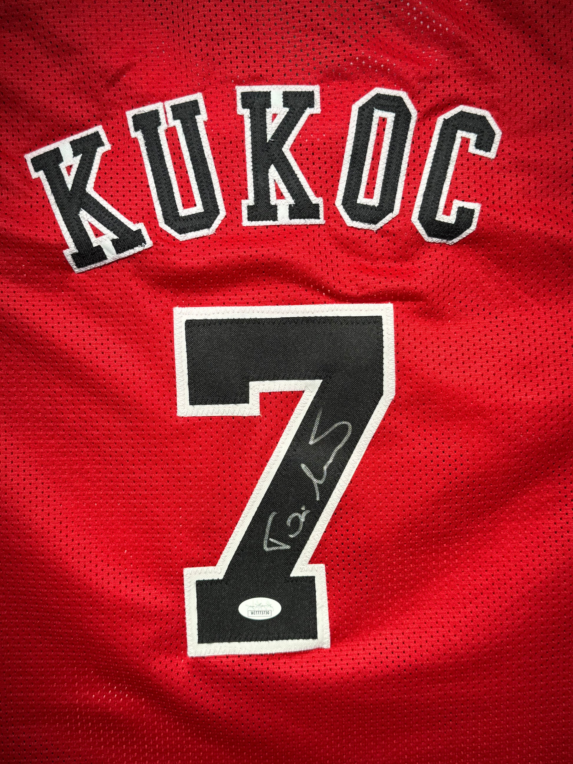 This piece captures Kukoc's significant role in three consecutive NBA championships from 1996 to 1998, showcasing the skill and vision that established him as one of the most accomplished European players in NBA history. The signature commemorates the forward whose smooth shooting stroke and exceptional passing made him a fan favorite in Chicago and demonstrated the high-level basketball intelligence cultivated in European leagues.